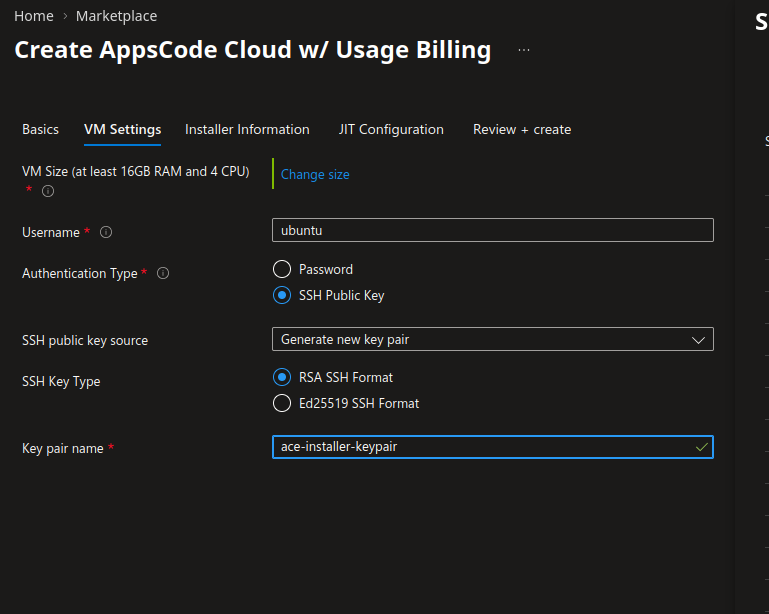 By default Username user will be created to your Installer VM. You can use one of the Password or SSH Key Pair to authenticate into the VM.