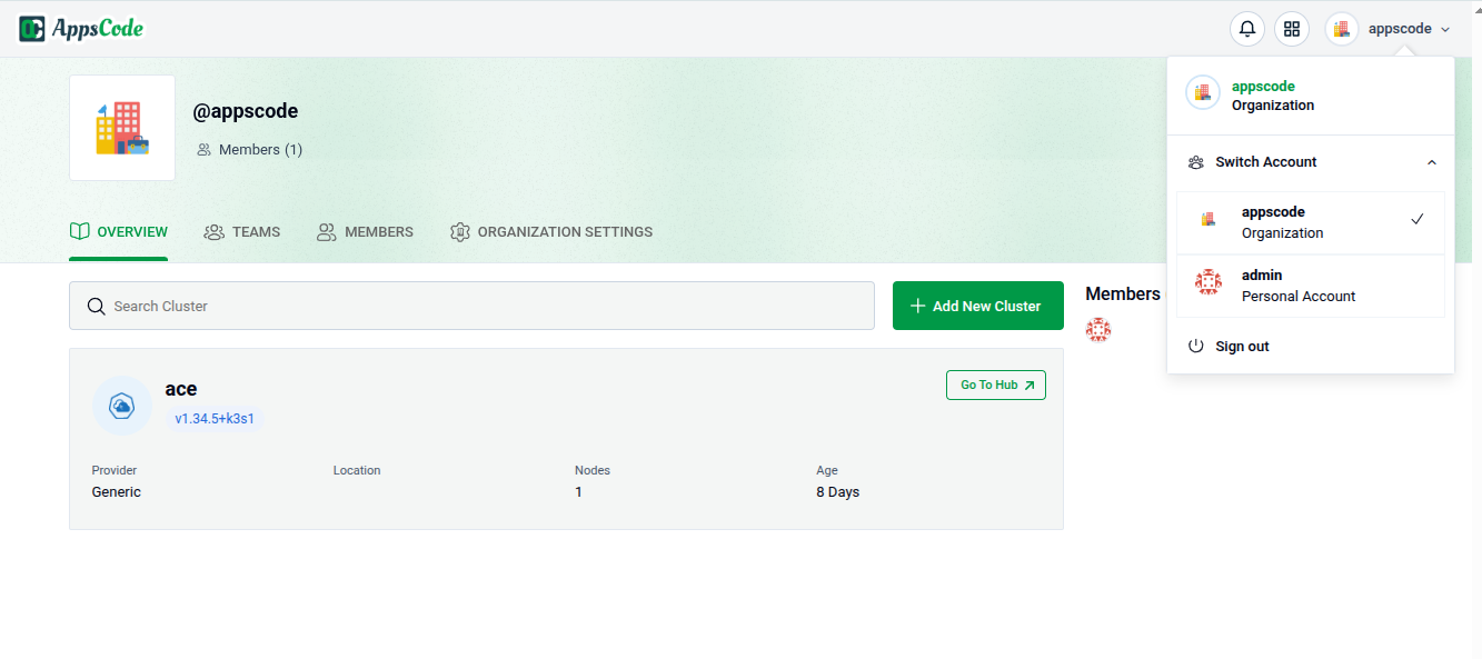 Once deployed, access the AppsCode Platform using the specified domain. Log in with the admin account credentials provided during the creation process.After the login process you will see the ACE dashboard user interface