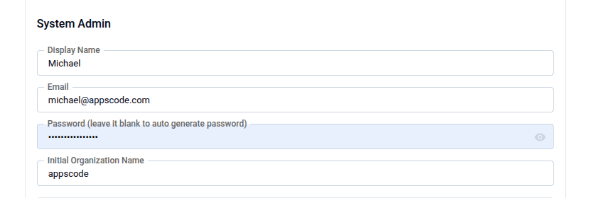 - Admin Account Password: The password for the administrator account.You may manually set a password or leave it blank to allow the system to auto-generate a secure administrative password.