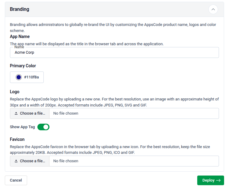 - Logo: Upload a 200x30px image (SVG/PNG recommended).