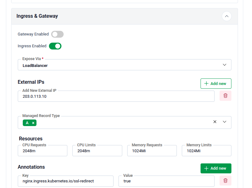 - Ingress & Gateway: Enable either the Gateway API or standard Ingress.