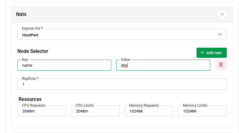 - Node Selector: Specify the node label (Key and Value) to control where NATS will be scheduled.