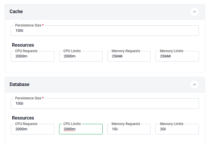 This secton is for Persistence & Resource Allocation. Properly sizing your resources is critical for production stability. Configure CPU Requests, CPU Limits, Memory Request and Memory Limit for both cache and Database