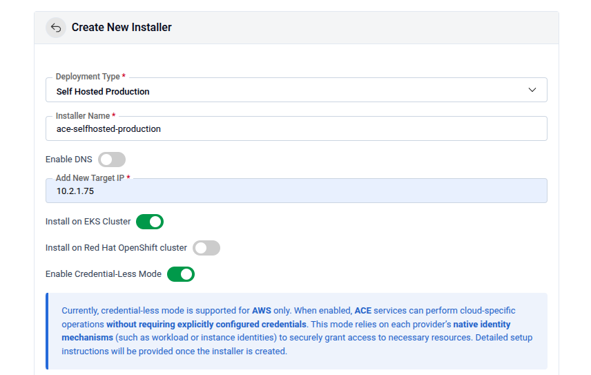 ace). - Namespace Automation: Toggle "Create namespaces during Helm install" if you want the installer to handle namespace lifecycle management.